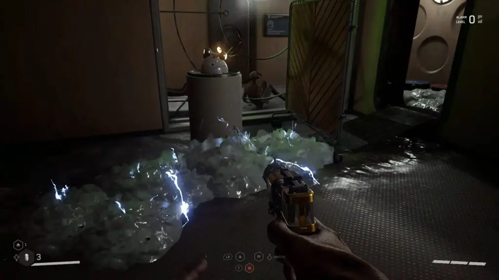 Proceed ahead and you will reach a small pedestal with polymer around it. Using shock on this pedestal opens the door ahead only for a few seconds, which isn’t enough for you to go through. Using shock on the polymer will give a continuous shock to the pedestal, which will keep the gate open. If there is no polymer around the pedestal, then you will need to get the polymer-throwing ability to open the door. Once the door is opened, continue ahead to reach a puzzle area.