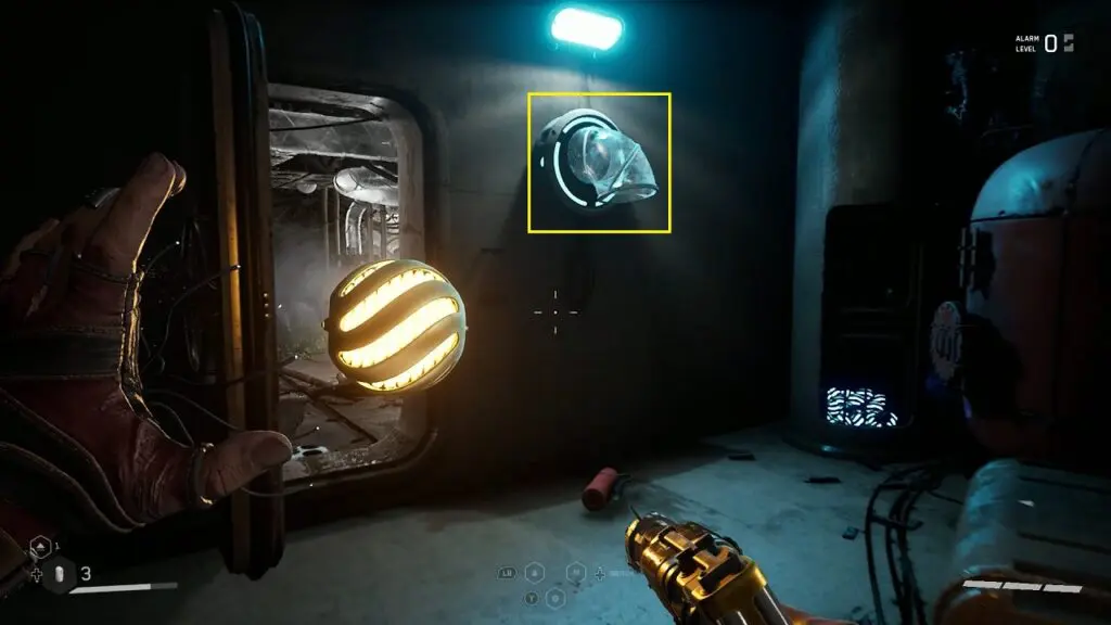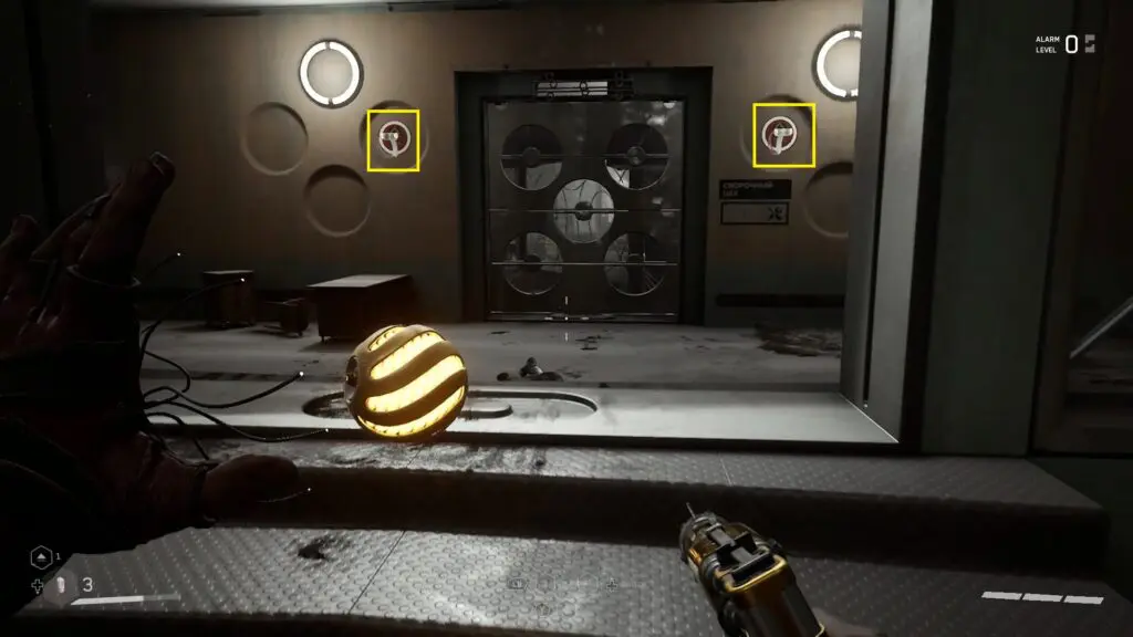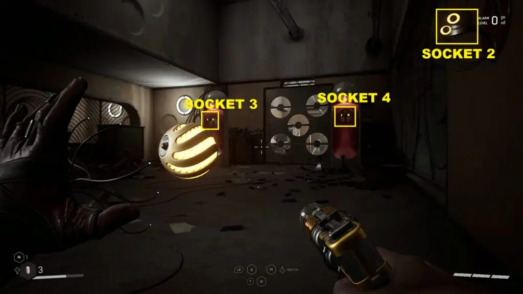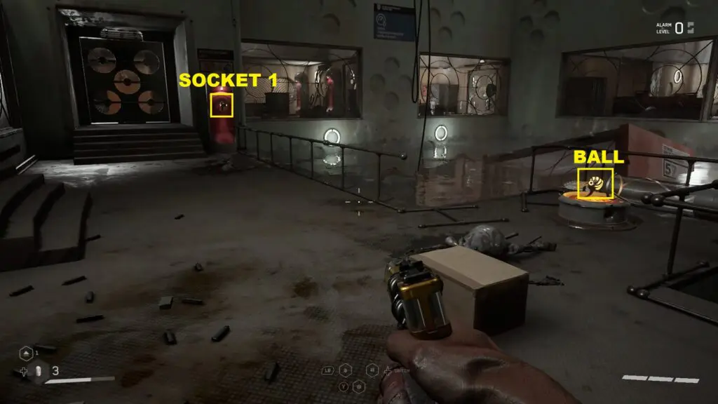 After reaching the puzzle area, pick up the ball as shown in the picture below, and insert it into Socket 1. This will open the door next to the socket. Proceed inside to reach the bronze chest. Open it to get the KS-23 – Collimator blueprint.