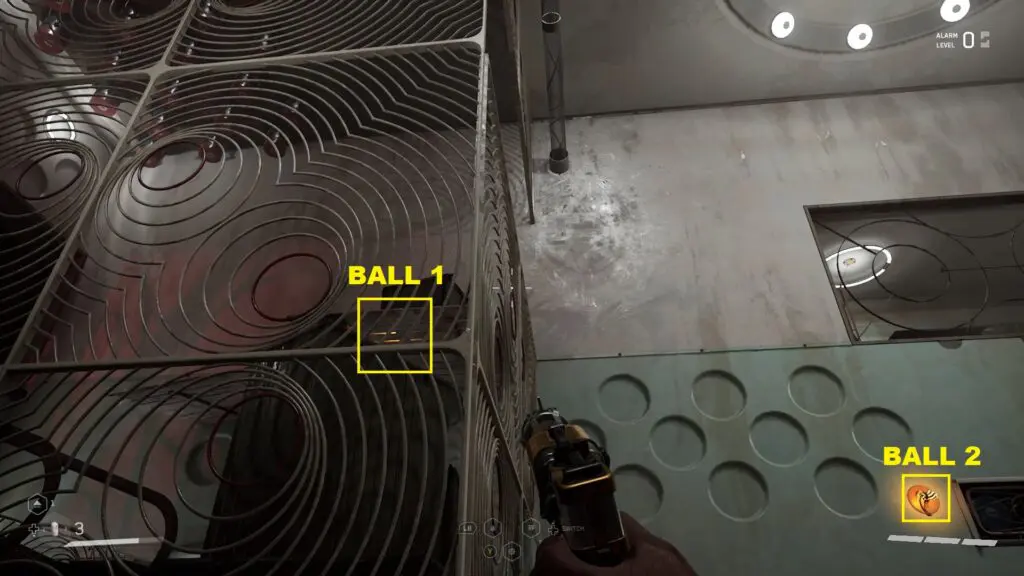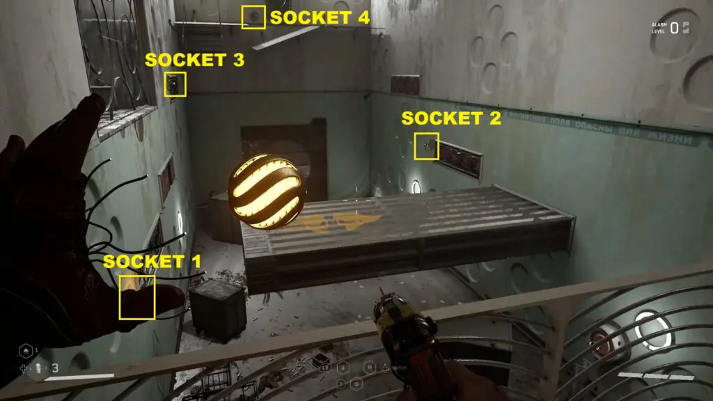 Pick up Ball 1 and jump down. Insert this ball into Socket 2 as shown in the picture below. This will make a platform come out. Use the crates to climb on this platform. Now take out the ball from Socket 1 and insert it into Socket 3. This will make another platform come out. Use this platform to reach the catwalk ahead. Now take out the ball from Socket 3 and insert it into Socket 4. This will open the door. Proceed ahead to reach the gold chest. Open it to get Kalash – Electromagnetic Polarizer and Pashtet – Handle blueprints. Now take the elevator to the top to exit the testing ground.