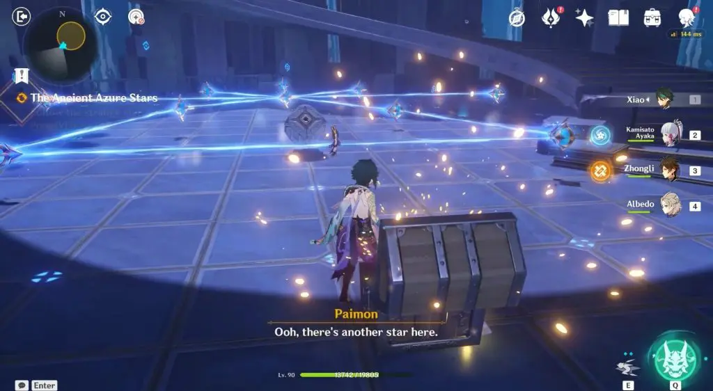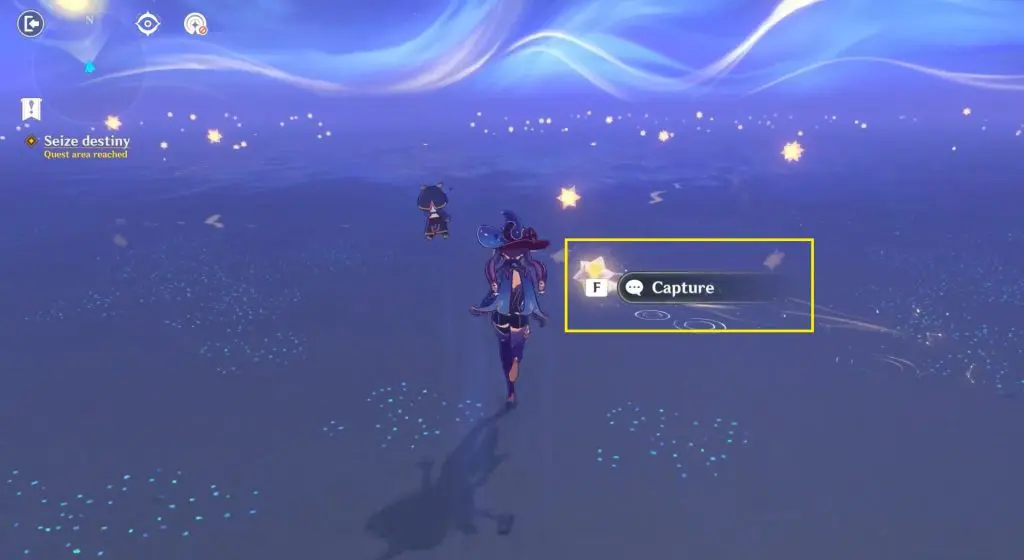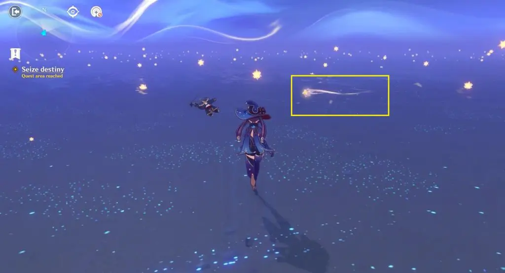 To complete the objective you will need to find and capture a moving star as shown in the pictures below. Wander around the area and you will find one easily. If you are not able to find a moving star, then use elemental sight to find it. On capturing the moving star, a cutscene will start. This completes The Ancient Azure Stars Story Quest.
