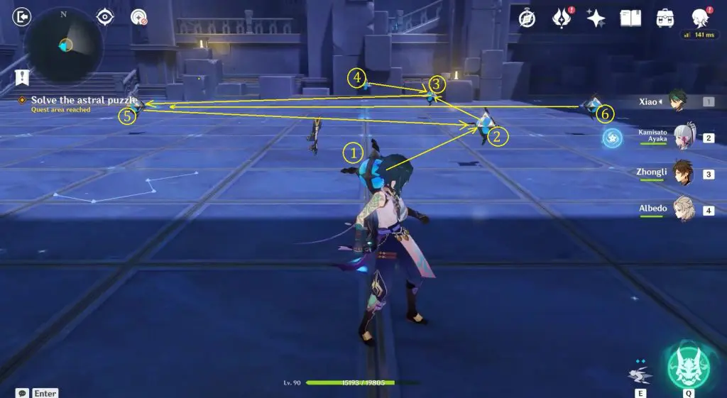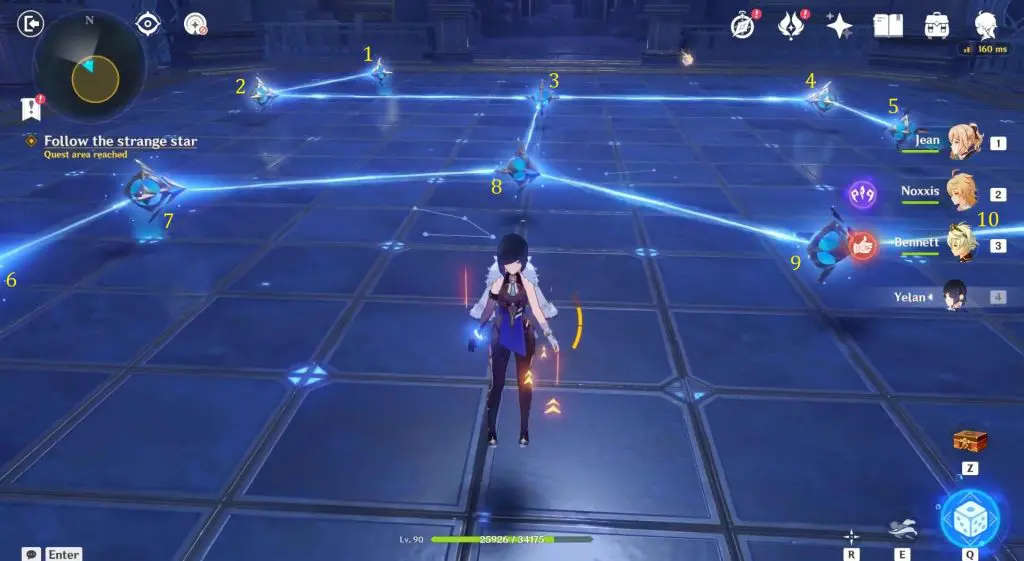 To solve the puzzle, you need to link the Star Guides in a specific pattern. The pattern that you need to form can be seen by looking up in the sky. The picture below shows the pattern for the first Astral Puzzle that you will encounter in the game. I have numbered the stars in the picture below to help you better understand the solution for this specific puzzle.