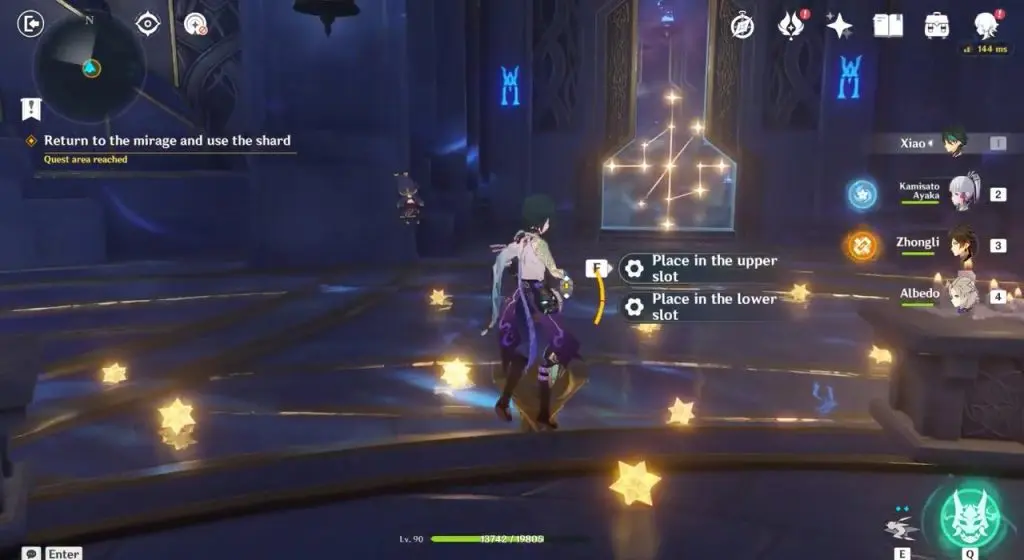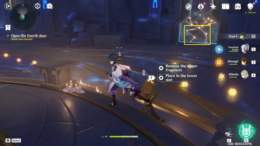 Once you have the two Asterism Shards, go to the door with the astronomical pattern as shown in the picture below. Interact with the projection platform in front of this door. Place Asterism Shard 1 on the upper slot of this projection platform and Asterism Shard 2 on the lower slot.