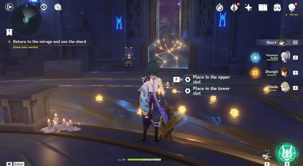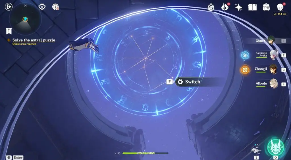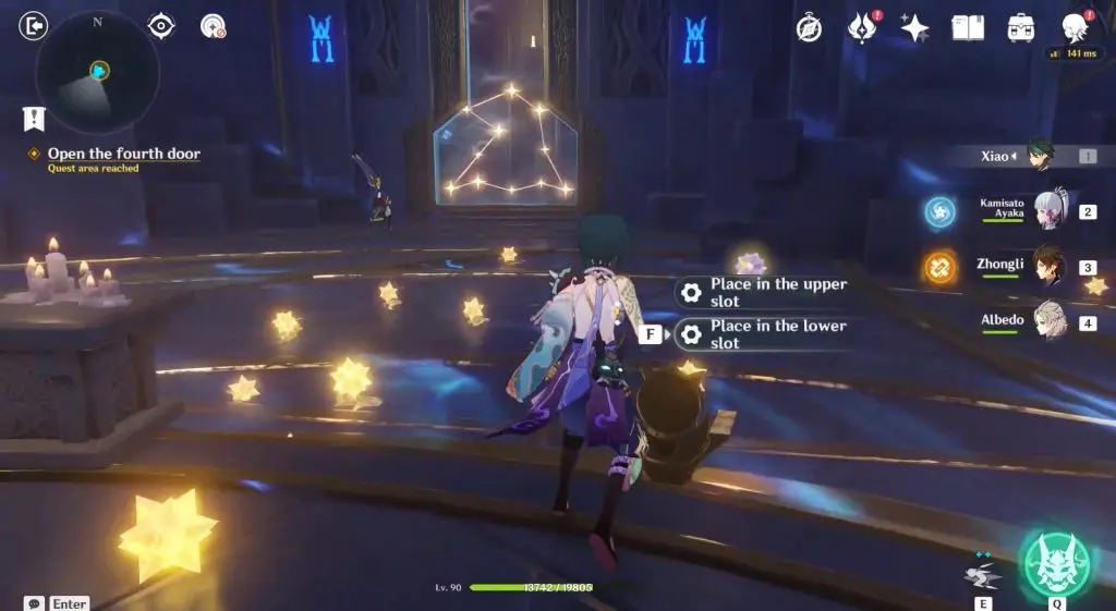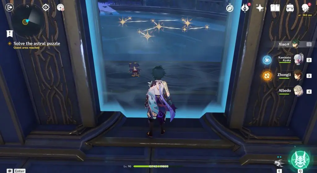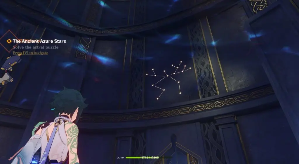 As the objective starts, go to the projection platform in front of the door with the astronomical pattern as shown in the picture below. Unfortunately, you won’t be having all the required Asterism Shards with you at this point.
