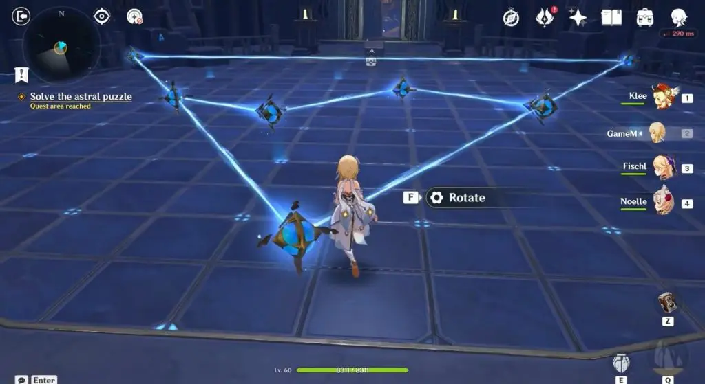 Go through the opened door and proceed ahead. When you reach the puzzle area, you will see several Star Guides. When a Star Guide is attacked, it shoots rays of starlight towards a specific direction and links up with other star guides. When you get close to a Star Guide, you can change the direction in which it is facing to help it link up to different star guides.