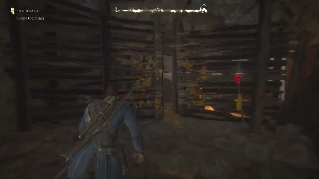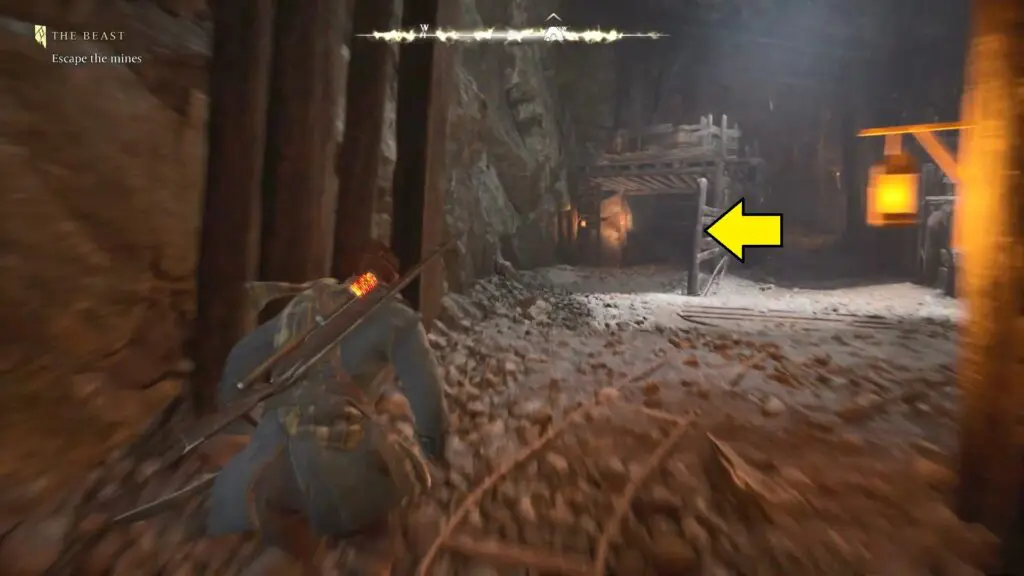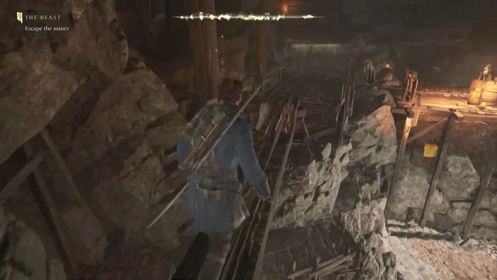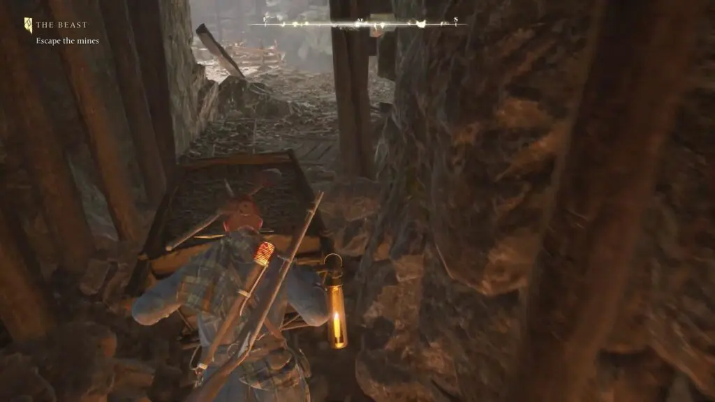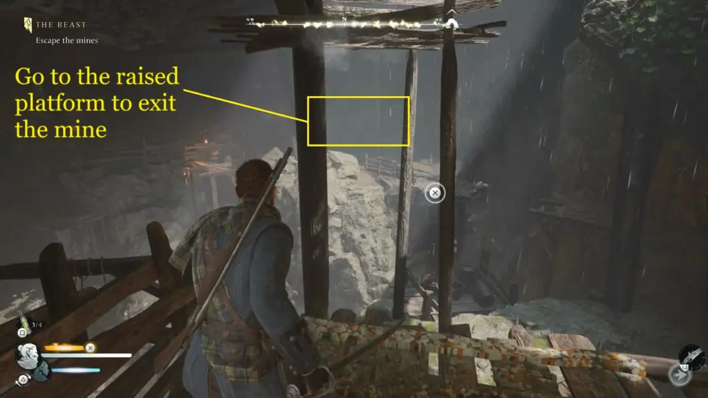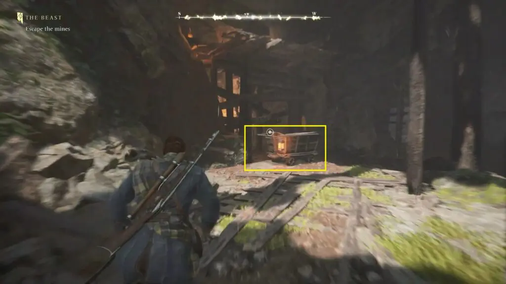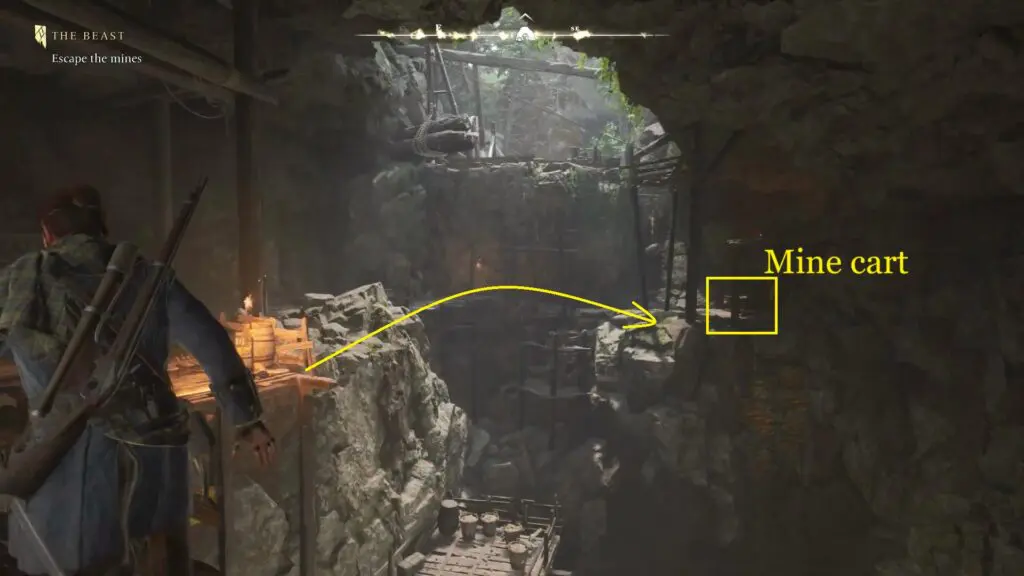 To exit the mine, players have to use the tunnel beneath the wooden platform near the mine cart track.