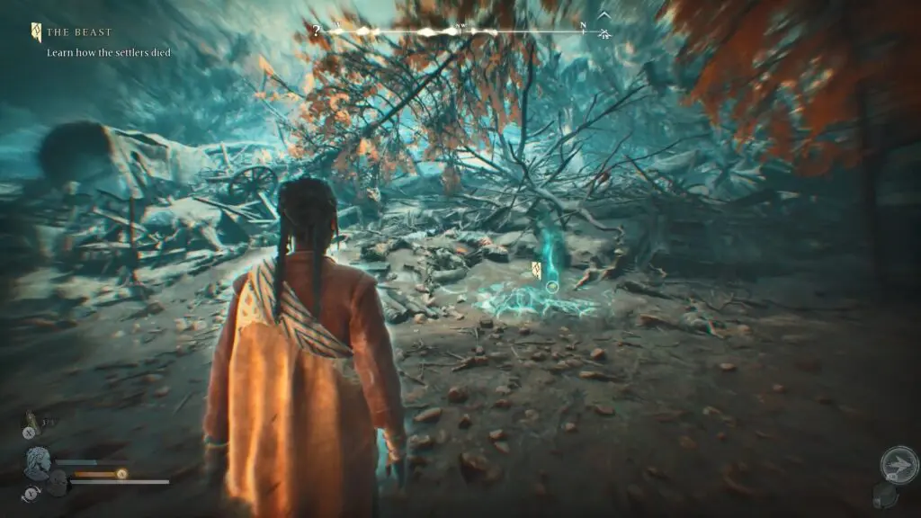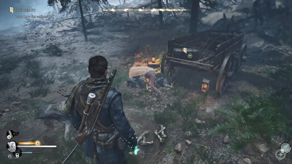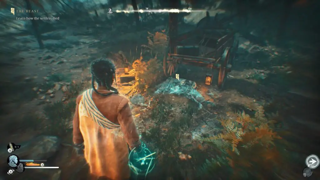 To understand the cause of their death, the player must interact with three locations. Switch to Antea and then look at the area around the shattered wagons