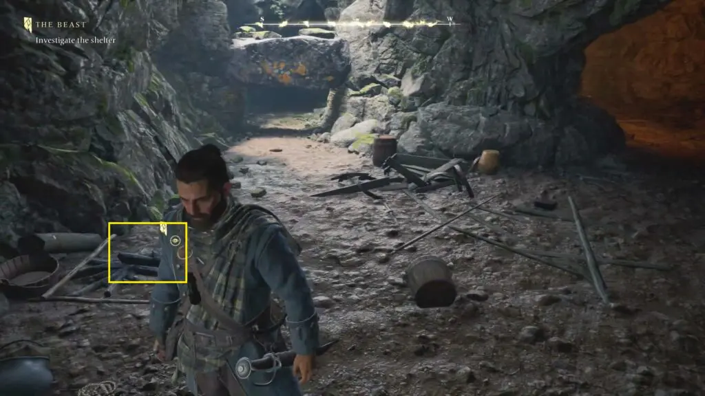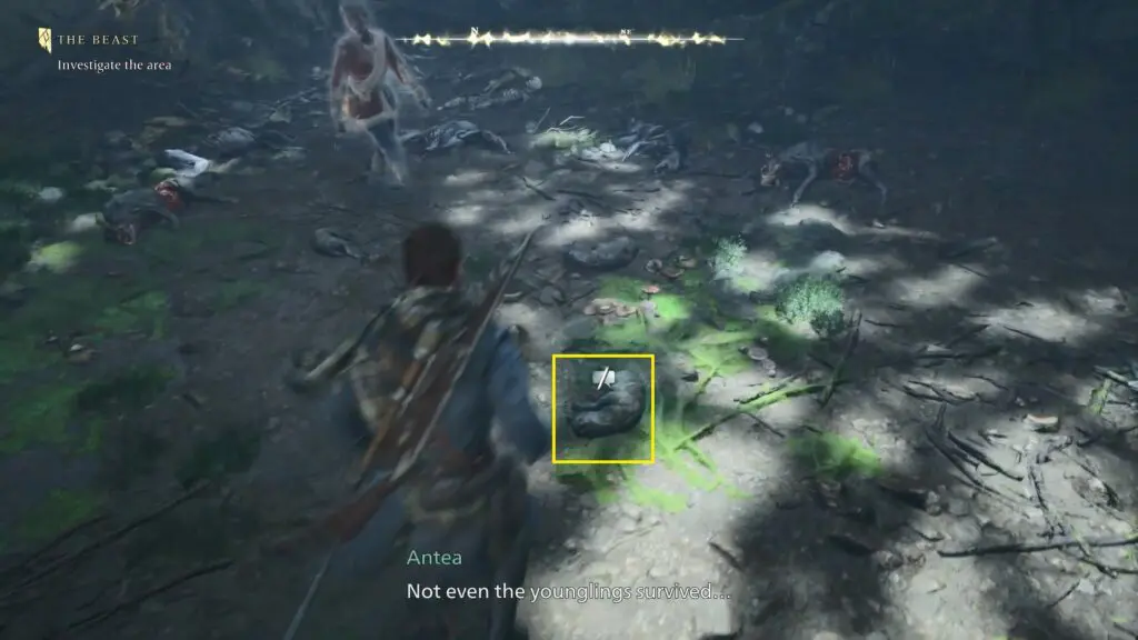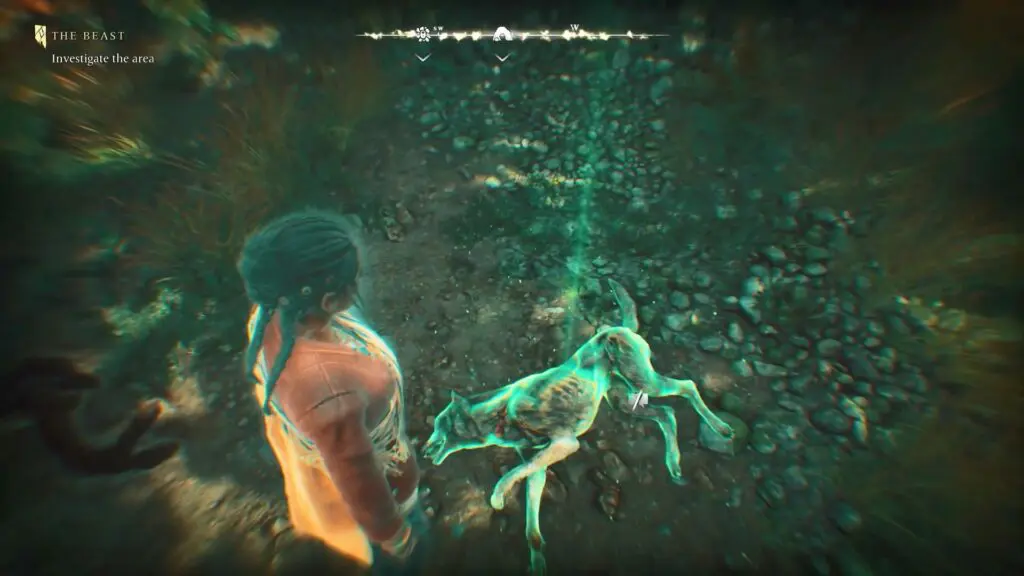 Follow the path to reach an open area with a wolf den. Interact with an echo from a corpse in the center of the area.