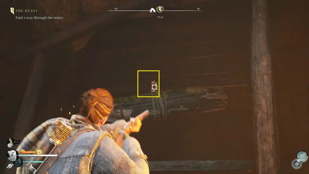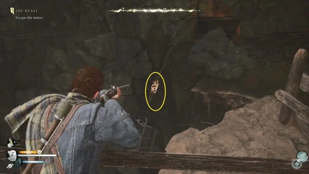 Go to the mine entrance and shoot at the wooden log tied by a rope to destroy the barrier beneath it. Enter the old mines.