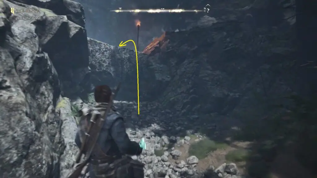 Continue climbing to reach the top and then go near the burning torches near the edge of the cliff.