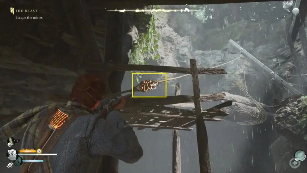In the next area, go to the wooden platform on the left and shoot the roop hanging from the mine cart.