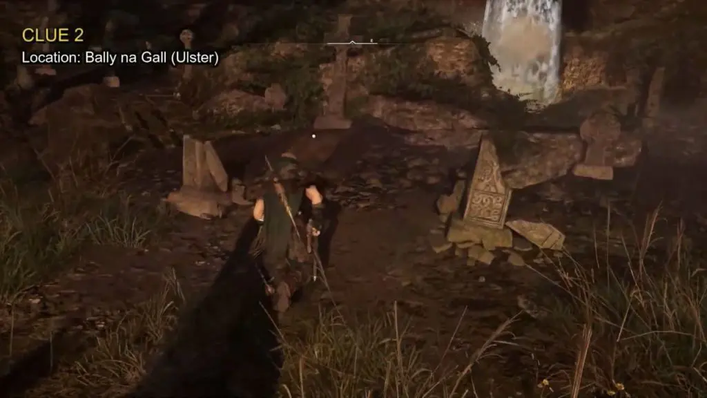 - The clue is located on a grave close to the waterfall behind the village.