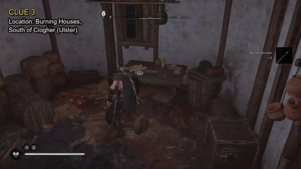 - The clue is located inside one of the burning houses.