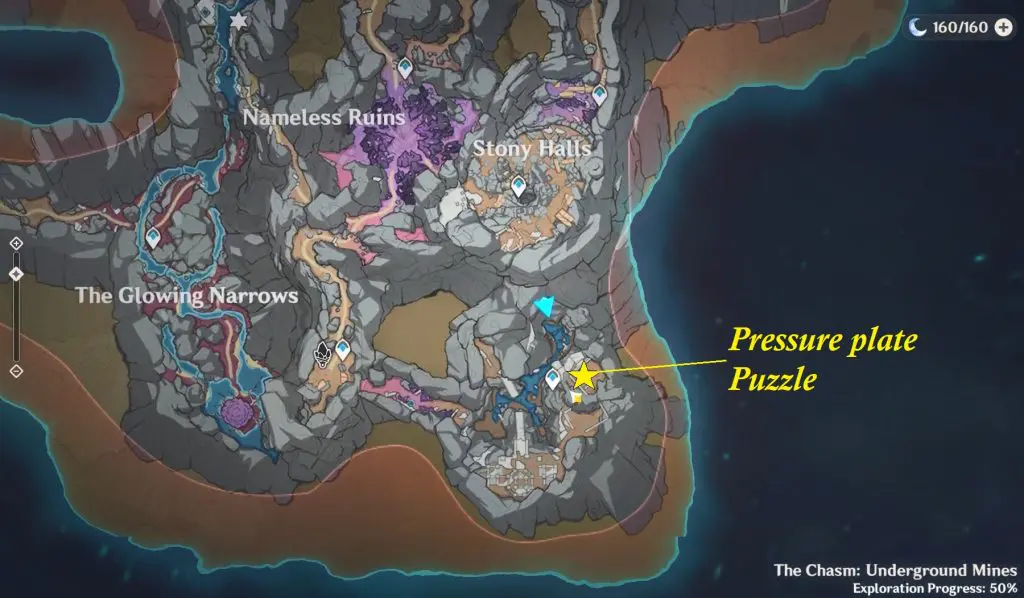This guide will show you how to solve the Chasm Stone Pressure Plates Puzzle in the game of Genshin Impact 2.6. This puzzle can be found west of the Stony Halls area at the location marked below. This Pressure Plates Puzzle is very easy to solve.