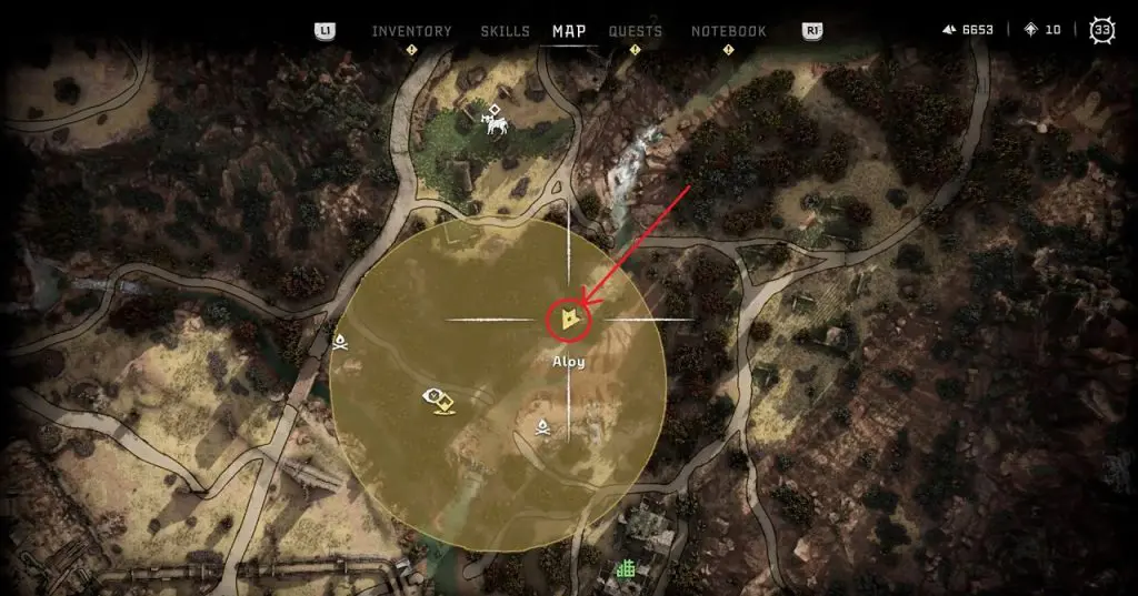 From the tower, go northeast along the river until you reach a broken bridge at the location marked in the picture below.
