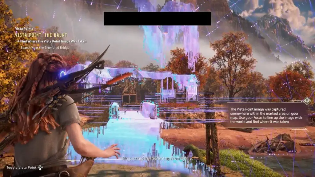 Stand on the edge of the broken bridge spanning a river bed. From there, look over to The Daunt Relic Ruin. Activate focus and superimpose the holographic image on the ruin as shown in the pictures below. An easy way to do this will be by aligning the bridge. When the hologram is properly aligned, the vista point will be complete.