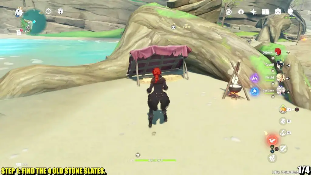 The first old stone slate is on the beach on the northeast side of the Kamisato Estate. The slate is under a small tent near the waverider waypoint. See the picture below for the location.