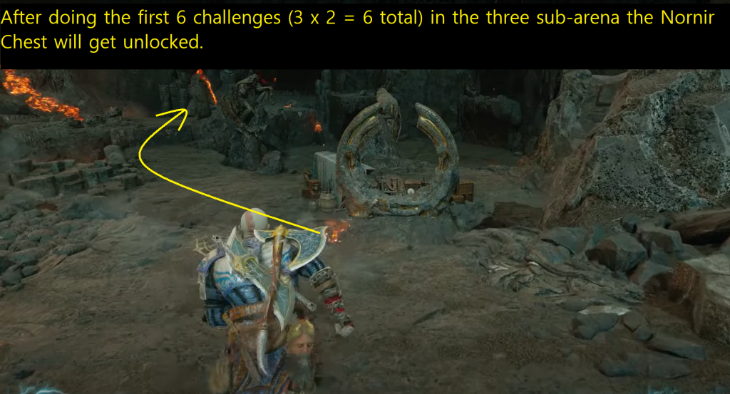 There are 3 paths going to different sub-arenas with a giant sword (left, center, right) in the east direction. Each sub-arena offers a unique set of challenges: You need to clear two challenges in each set sub-arena. After doing the first 6 challenges (3 x 2 = 6 total) the Nornir Chest will get unlocked.
