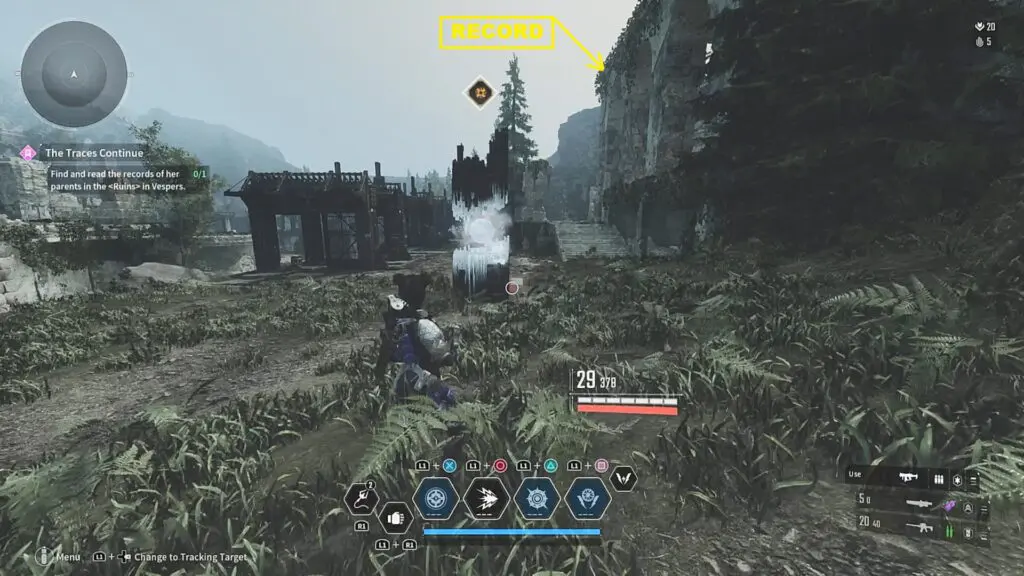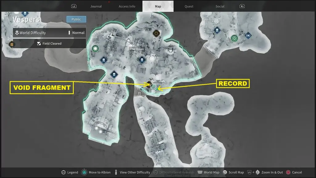 Once you have unlocked free roam on Vesper’s, you can now go and collect the record. The location of the record is marked on the map below. It is near the void fragment as shown below. Climb up the wall on the east side of the Void Fragment, and you will find the record at its edge as shown in the pictures below. Listen to the record to complete the quest.