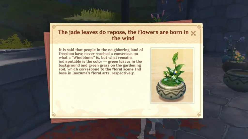 When the quest begins, go to the northeast corner of Ritou Square and chat with Fushizome, who is a florist. She will want that the Traveler constructs a flora courtyard using Ikebana. To begin a challenge, approach the pot opposite Fushizome and select “Construct Floral Courtyard.”