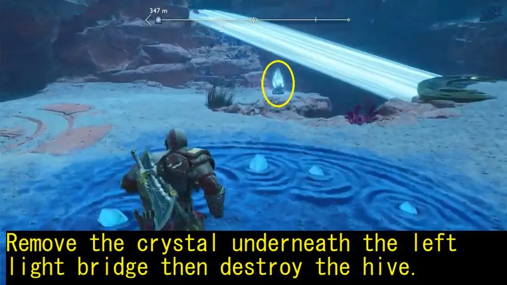 Remove the crystal underneath the left light bridge then destroy the hive. Place the crystal in its original location again to form the light bridge.
