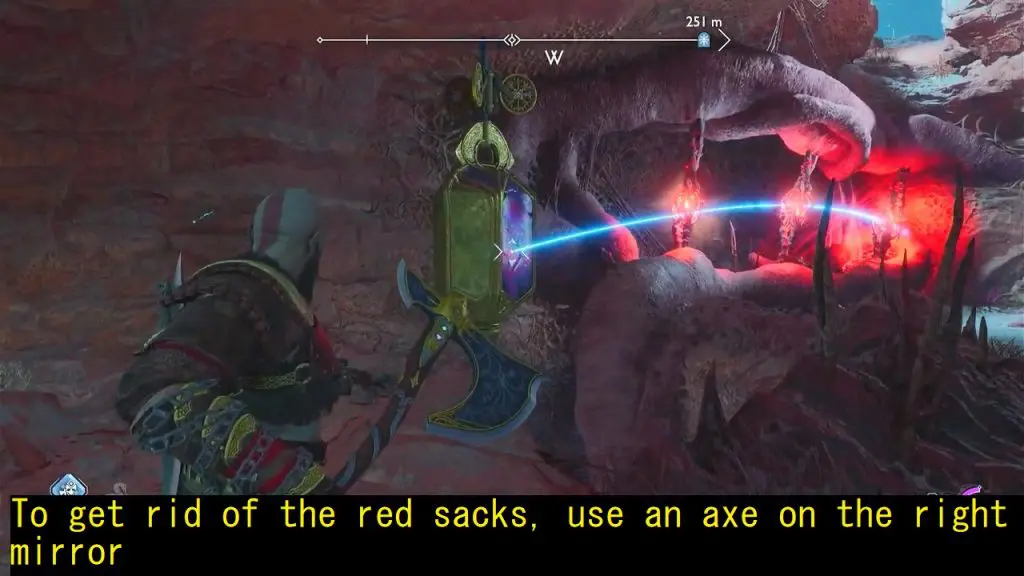 To get rid of the red sacks, use an axe on the right mirror. Then burn the vines on the left mirror with purple arrows.