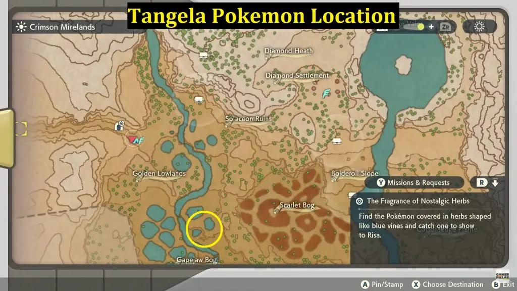 Tangela is a Grass-type Pokemon. Tangela Pokemon are commonly found near Gapejaw Bog in Crimson Mirelands. I have marked the location on the map. Crossing Slope in the Cobalt Coastlands. It can be found during all times of day and in any weather condition. You can either battle with a Tangela or Catch it using a heavy pokemon ball.
