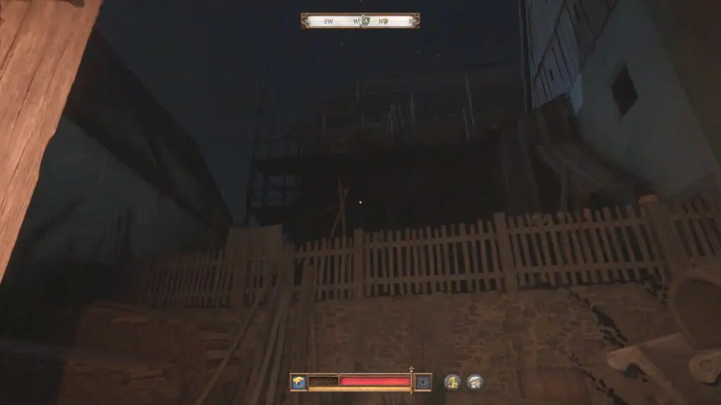 You must wait until nighttime. Once everyone in the tavern is asleep, climb the scaffolding at the back and enter through the window.
