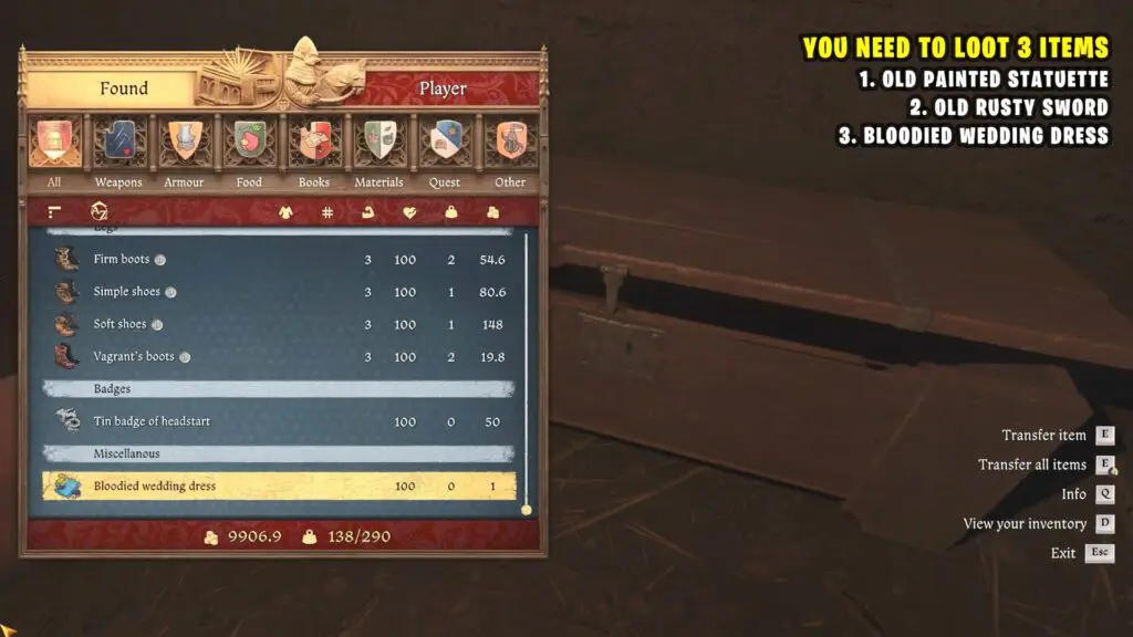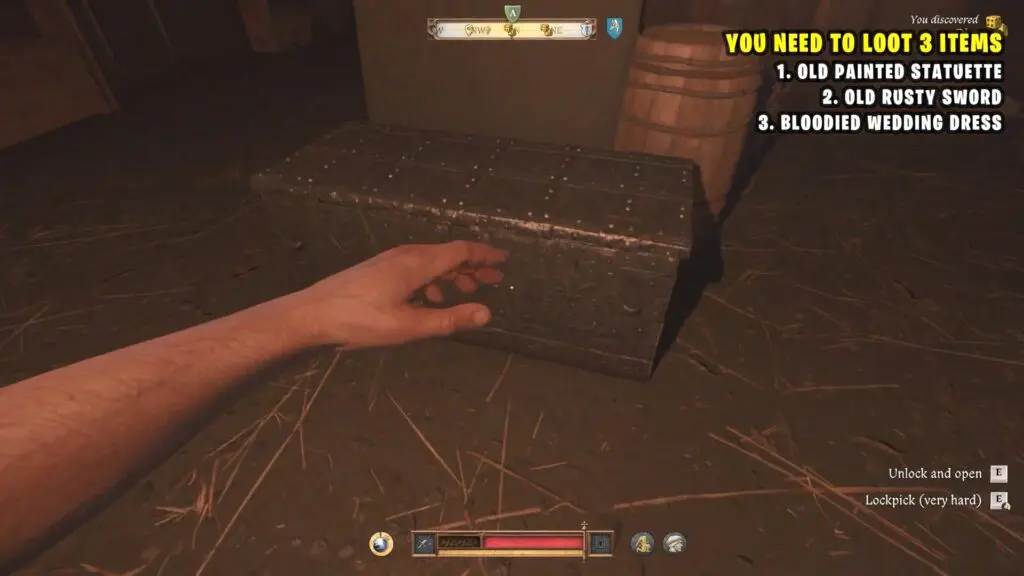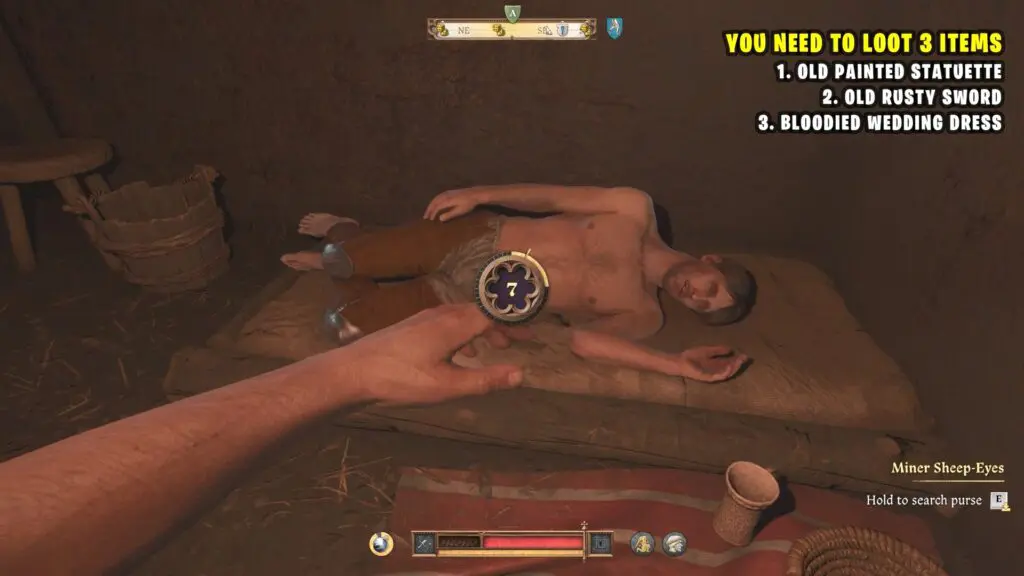 Now, head to the other side of the basement. There, you’ll see a miner sleeping. Sneak up to him and steal his key. Then, open the chest nearby to find a bloodied wedding dress.