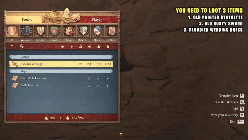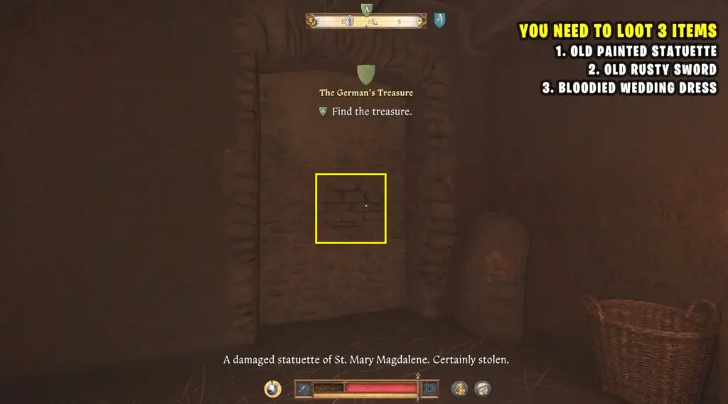 Once you have the key, go downstairs to the basement. When you enter, turn left and look for a broken wall in the corner. Interact with it to pull out the bricks and reveal a secret spot. Inside, you’ll find an old rusty sword and two treasure maps.