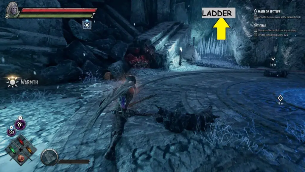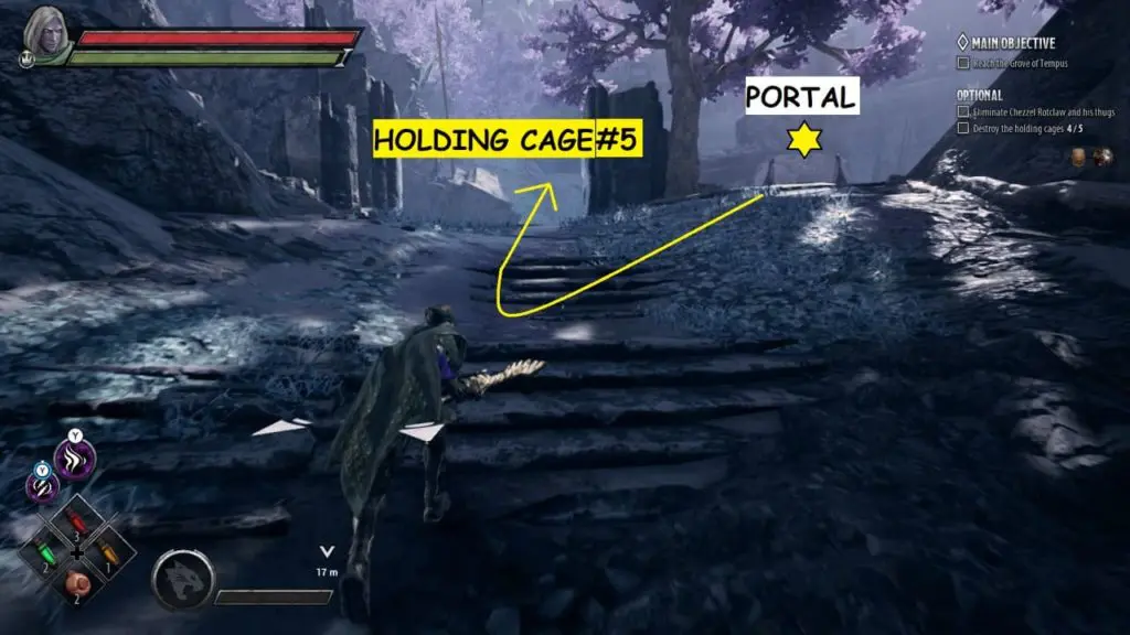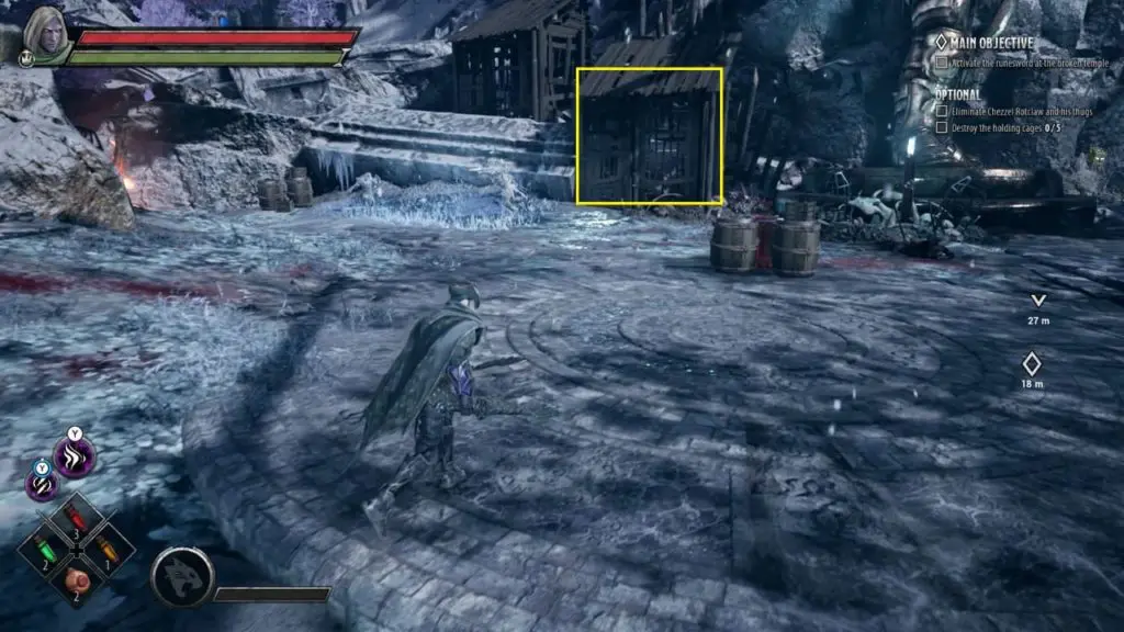 Holding Cage is a small hut with a locked iron grilled gate. The holding cage can be found at Broken Temple Plaza. You can locate a holding cage at Broken Temple while doing the main objective, ‘Activate the runesword at the broken temple.’