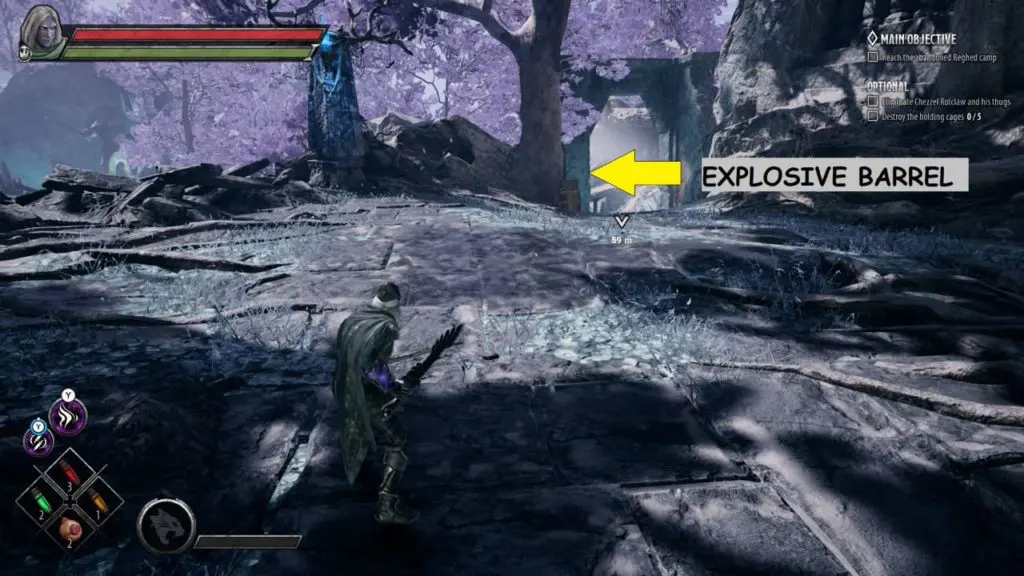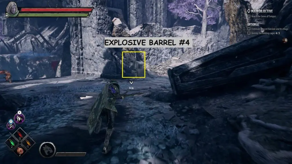 You will find the last explosive barrel on the path to Grove of Tempus. If you will follow the main storyline you will get the main objective ‘Reach the Grove of Tempus’.
