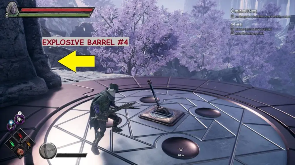 The location of Explosive Barrel #3 is on the way to the ‘fallen spire.’ The main objective will be ‘Activate the runesword at the fallen spire.’ Follow the main path towards the edge (end), then descend to the lower level to find Explosive Barrel #3.