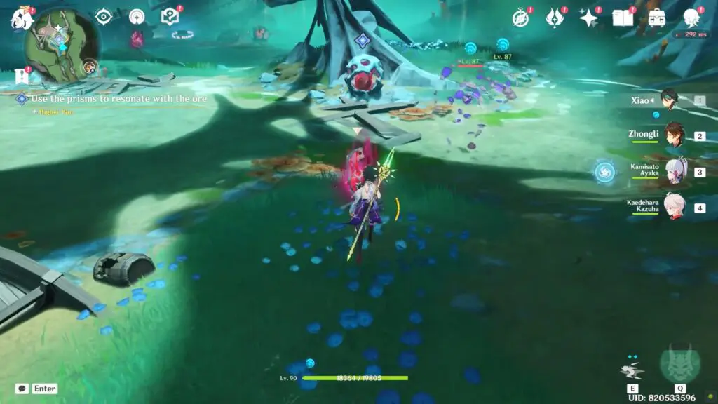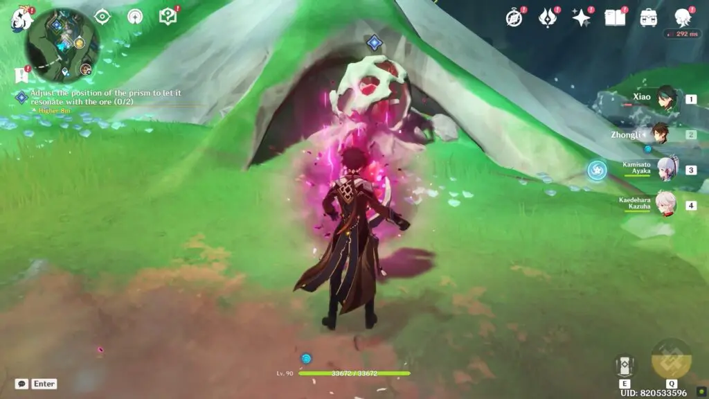 The prism should then be hit in such a manner that the Prismatic Resonance wave travels in the direction of the sealed ore and strikes it. This will break the seal surrounding the ore, allowing you to collect the crimson-colored stone hidden within it.