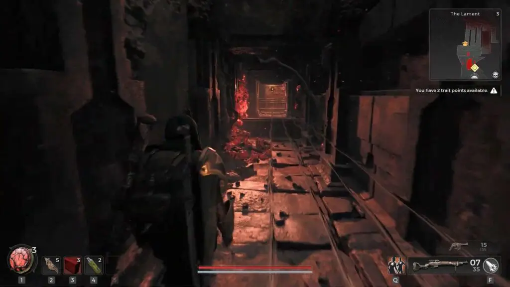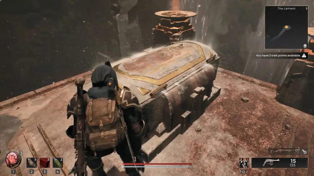 Players must time their movements carefully to zig-zag through the lanes to evade the oncoming arrows. The traps’ firing order changes as players reach the midpoint of each trap lane. Also, don’t forget to interact with the lever at the end to deactivate all arrow traps. The first chest is lying near the lever.