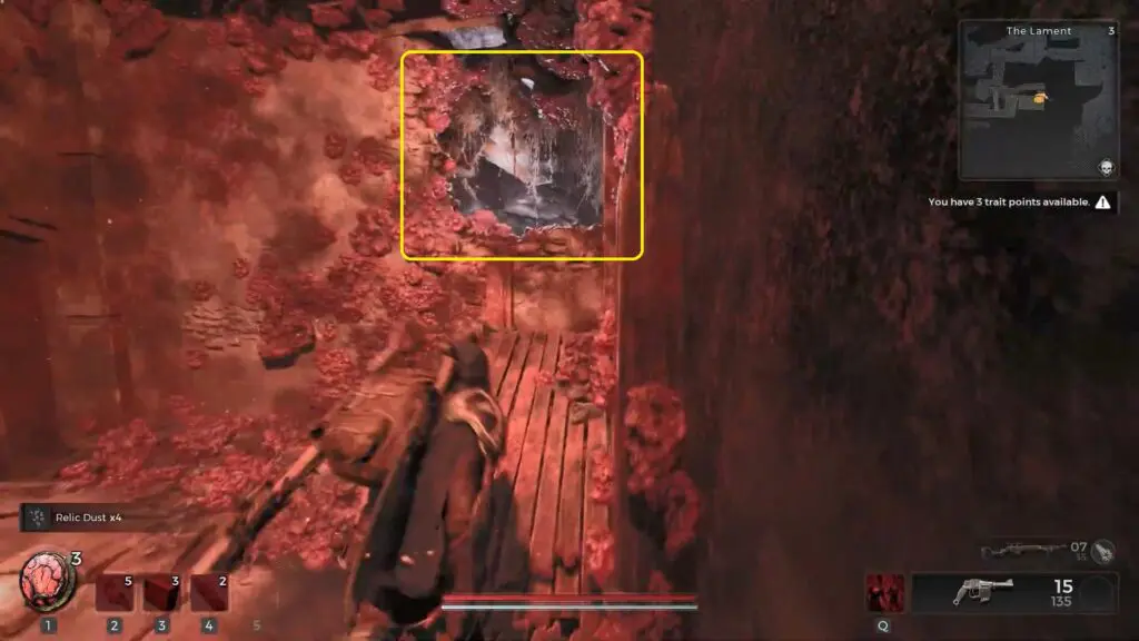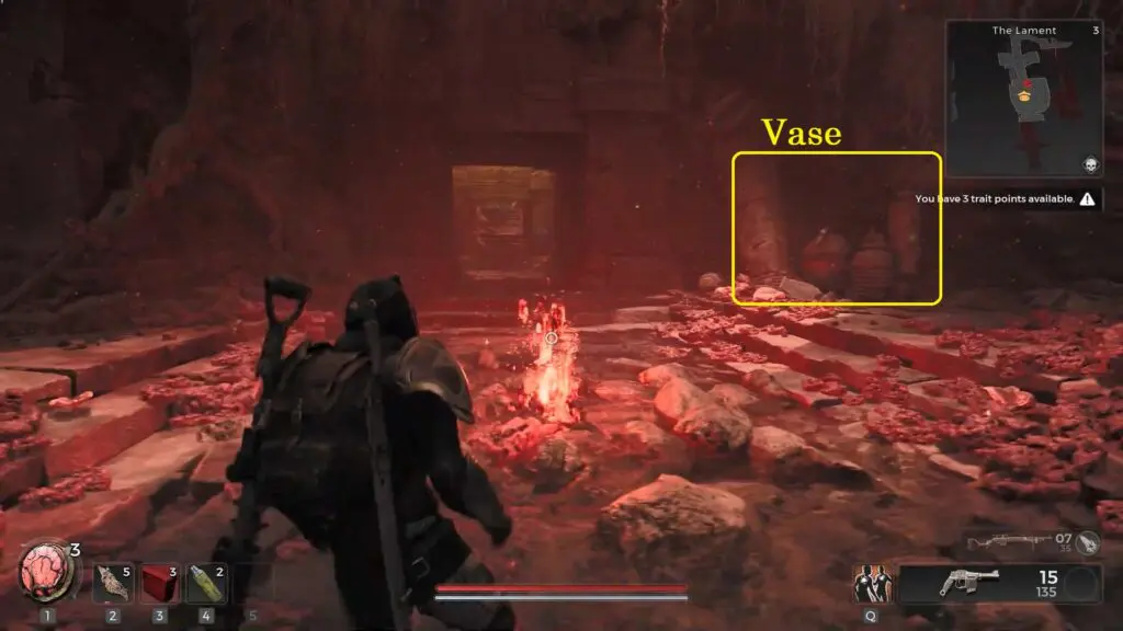 Retrace your steps back to the checkpoint behind the Lament Door. Look for a collapsed pillar in one corner of the room and some vases. Break the vases to reveal a hole leading one floor down.