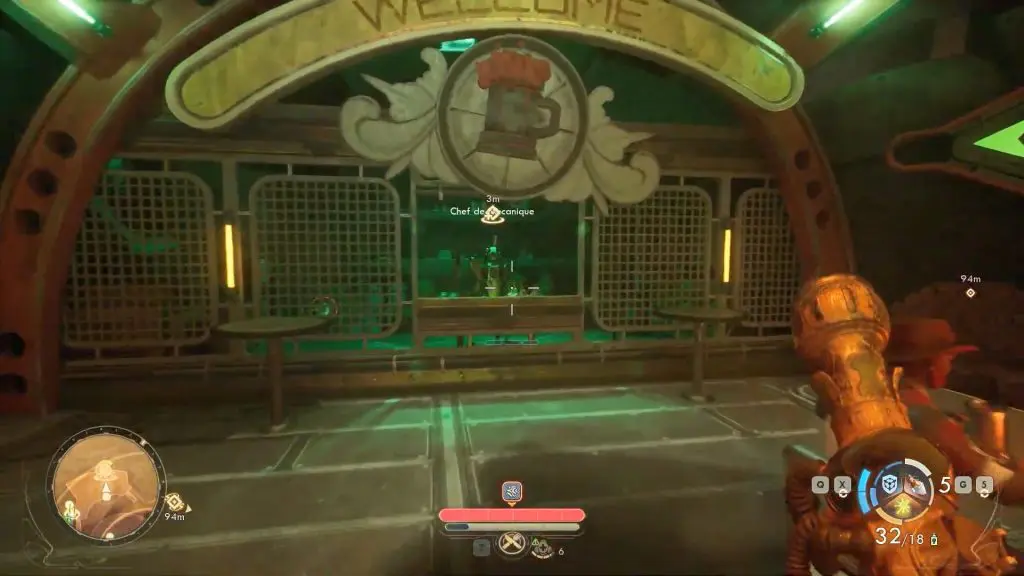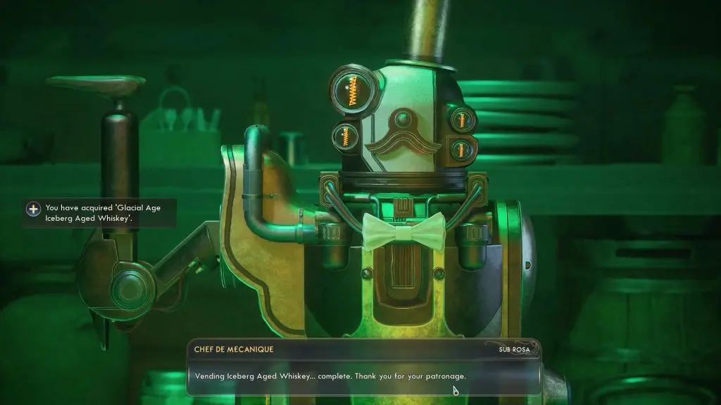 Leave the Second Choice and head to the outdoor bar on the opposite side of the bazaar, where you will find the bar operated by a robot named Chef de Mechanique.