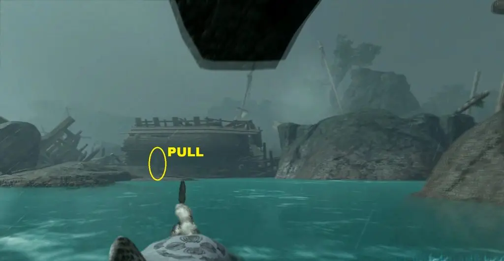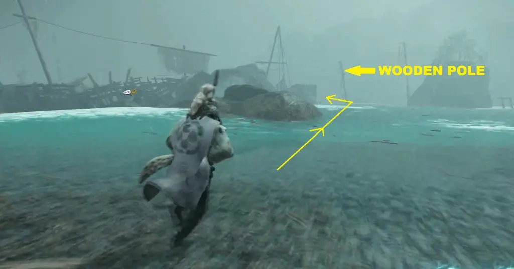 1) Crawl back outside from the hole in the ship and swim straight forward until you reach the wooden pole as shown in the picture below. From the wooden pole, turn left and swim straight ahead till you reach a broken boat (See the third picture below). From the broken boat, climb up the rocky mountain.