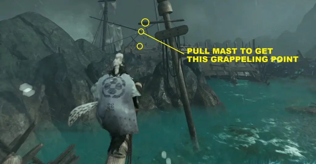 5) At the top of the boat, use the three grappling hooks (See yellow circles in the picture below) to jump to the other side. To get the middle grappling hook, you will have to pull a mast as shown in Step-3 before.