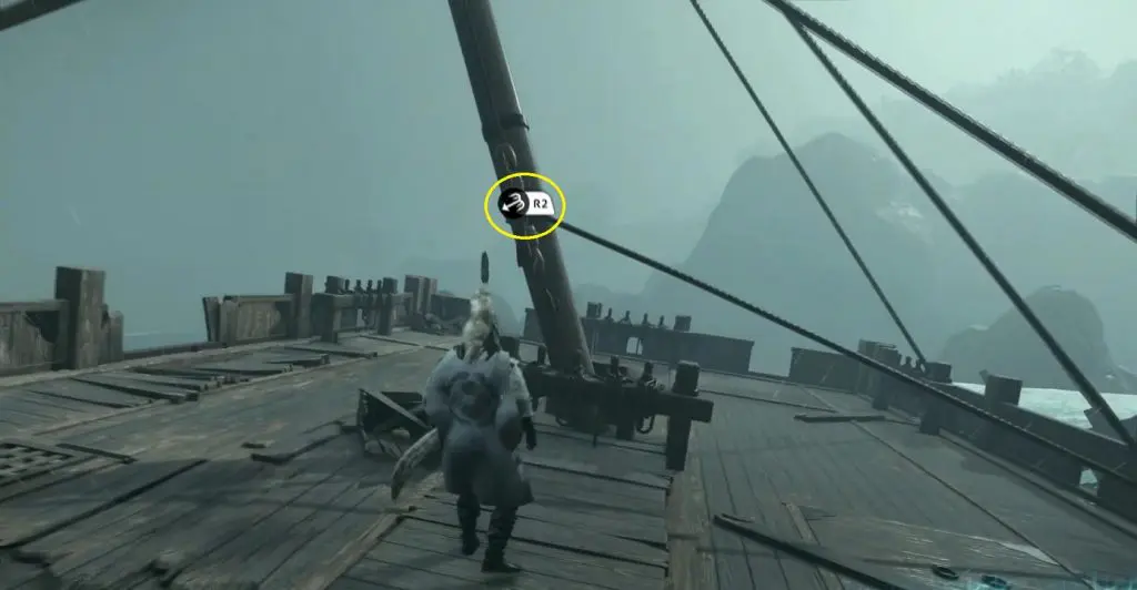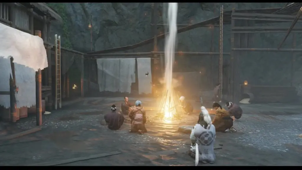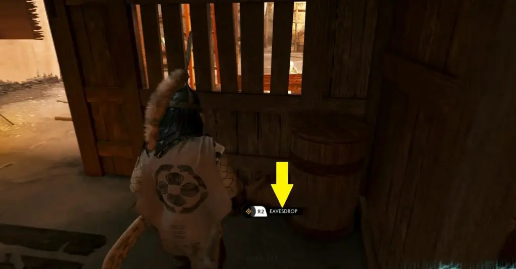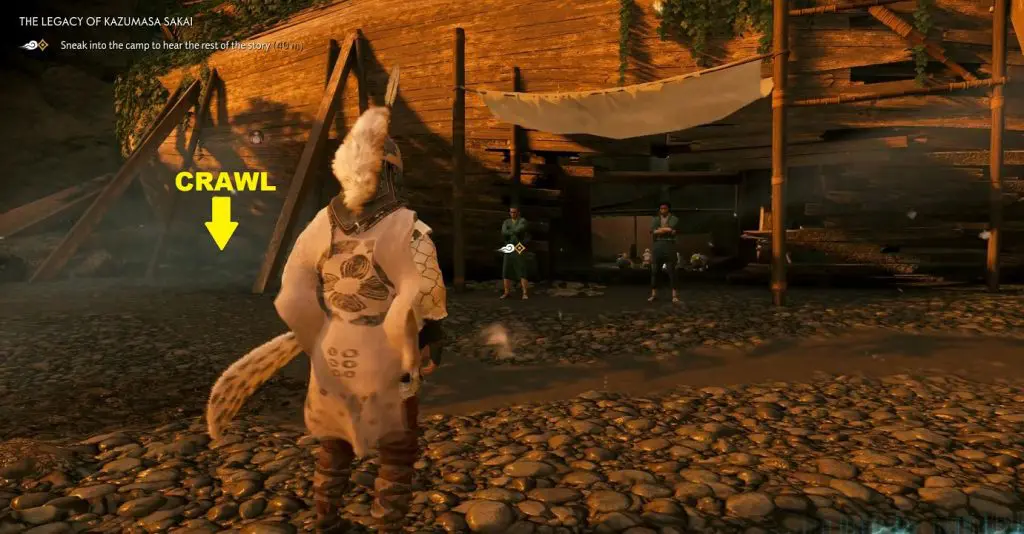 During the cutscene, while the storyteller is telling the story, you will inform him that you are the son of Kazumasa Sakai, only to be kicked out of the camp. Your next objective will be to sneak into the camp to hear the rest of the story so that you can know the location of the Horse Armor that the storyteller mentioned in his story before. To hear the rest of the story, crawl through the small hole on the ship’s left side as shown in the picture below. On the other side, you will see the eavesdropping location right in the front. Go to the marked location and press R2 to hear the rest of the story. After you have listened to the complete story, you will know the location of the horse armor.
