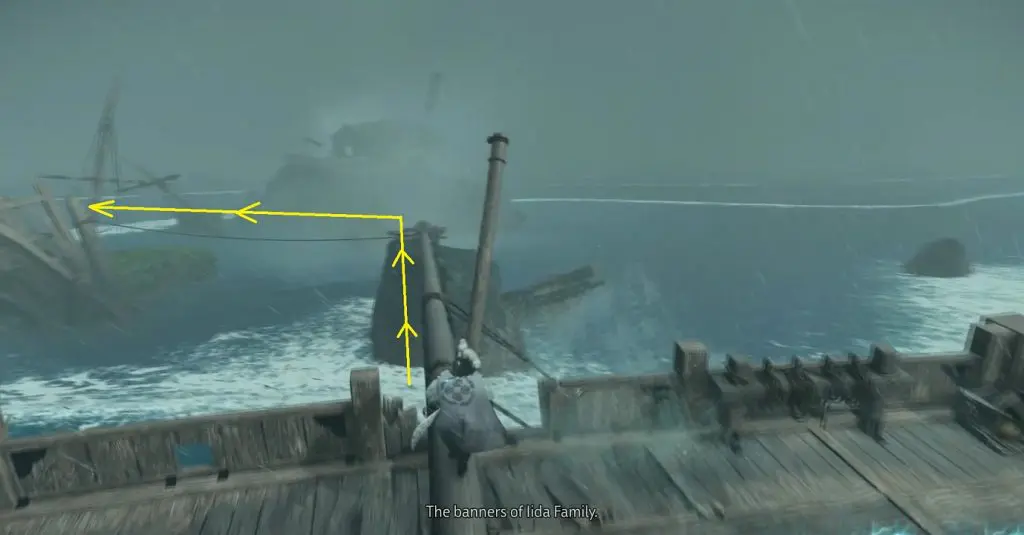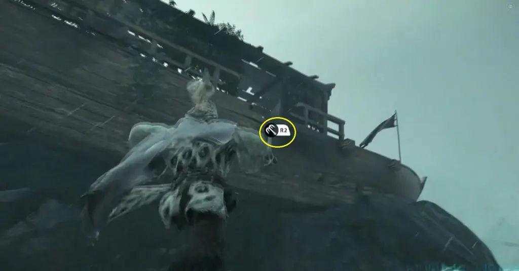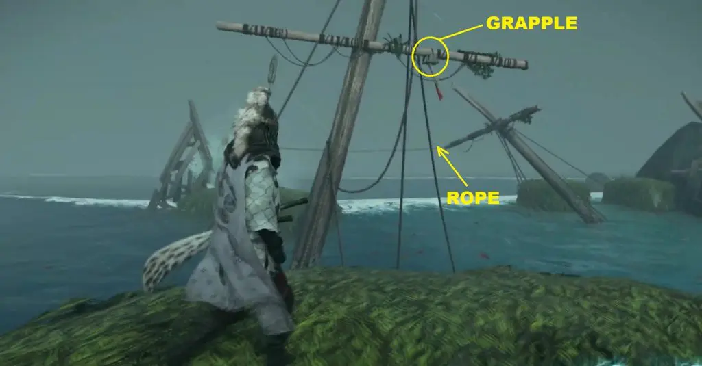 4) Swim back to the location marked 3 (See Step-2 above). Here you will find a broken boat supported on a beam. Pull the beam using your grappling hook. This will remove the support from the boat and it will rollover. Climb up the boat.