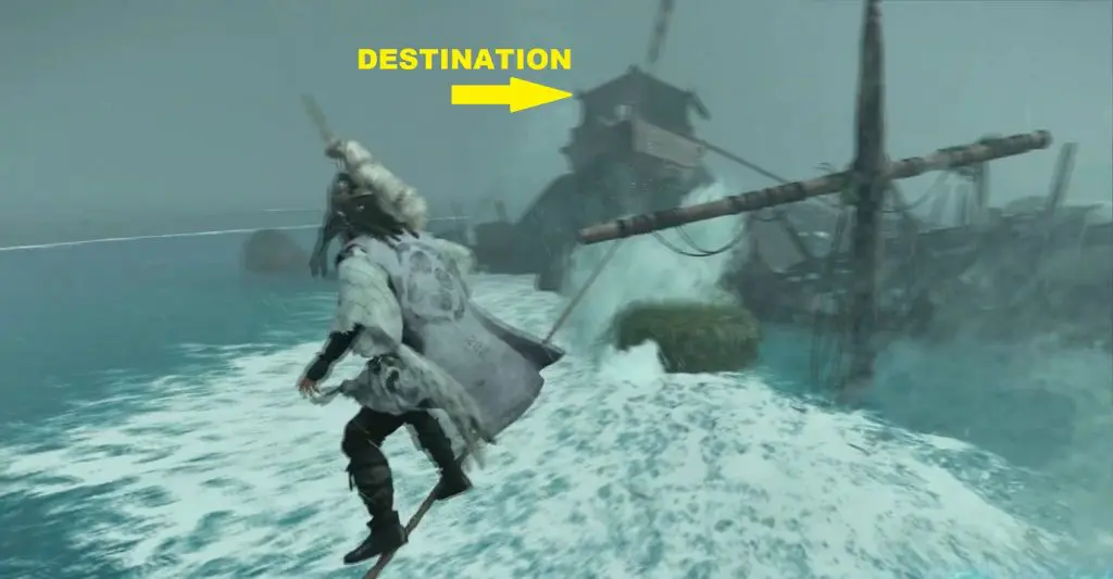 11) Here use the grappling hook on the ship above to enter it. This is your destination. Inside the ship, you will find the Horse Armor.