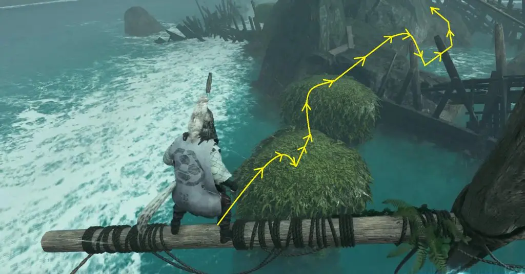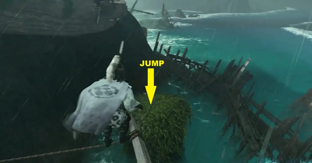10) At the end of the rope, jump down on the landmass below.