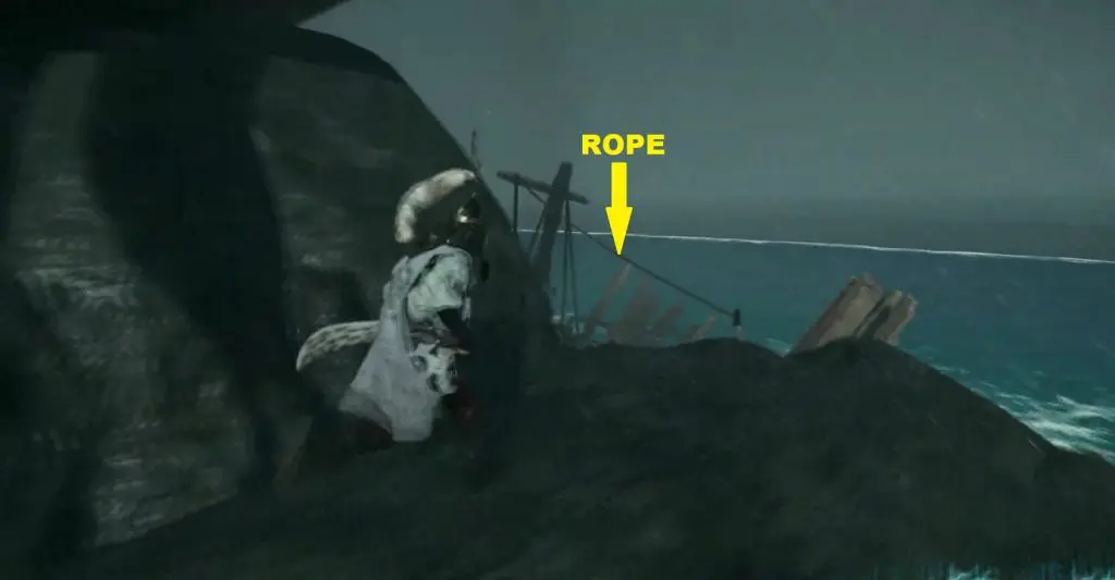 8) On reaching the rope shown above, you will be able to see your destination in front of you. At the end of the rope, jump down on the landmass and then jump down on the water. Swim ahead and climb on the rocky ground at the end as shown in the picture below.