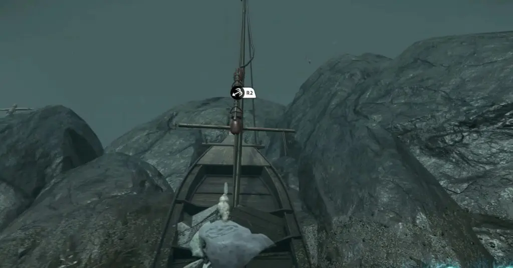 3) After swimming through the opening marked 2 (See the picture above), turn left and swim through another opening. You will find a boat here. Use your grappling hook to pull the mast forward. This will be helpful later during Step-5.