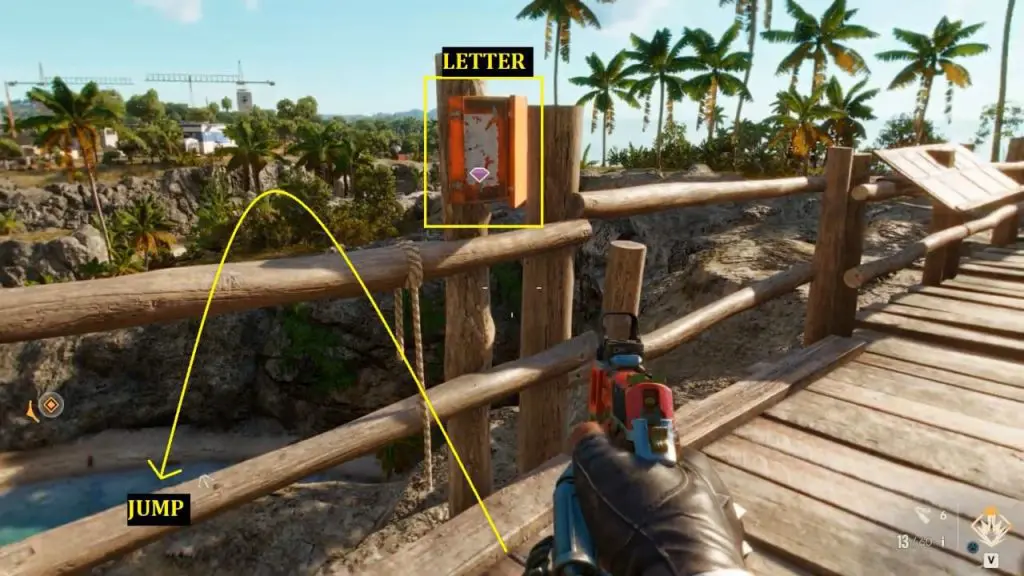 As per the clue from the letter, your goal is to explore a sea cave to locate the treasure. Luckily, the blue hole cave (sea cave) is nearby only. To get to the cave, simply jump across the wooden railing where you read the letter, dive into the water near the jellyfish, and take a long dive into the water.