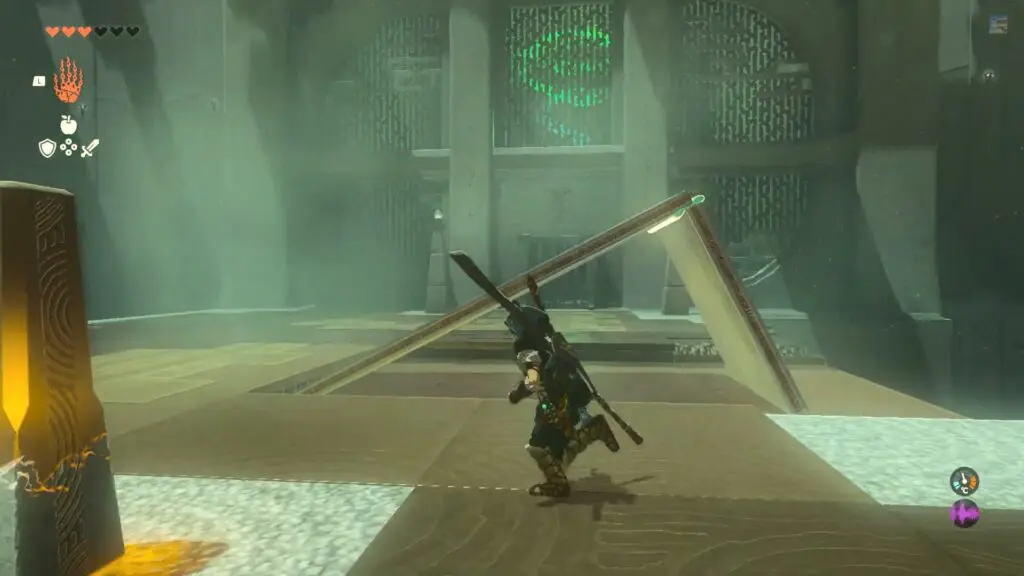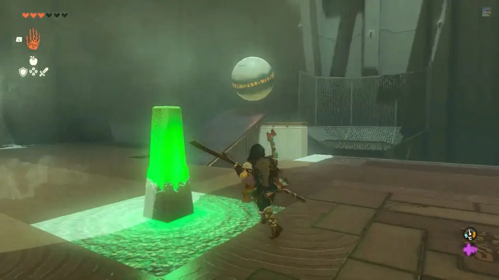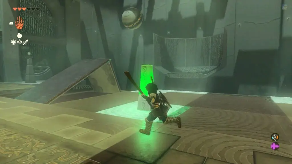 Once everything is set, hit the glowing activation pillar to release a ball that will come down from the downsloping ramp and jump off from the makeshift ramp into the basket across the gap.