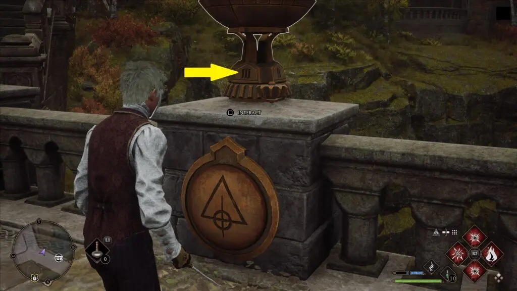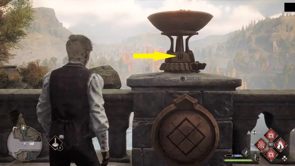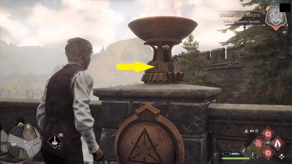 On the bridge, you will find four torches. Use Incendio spell to light the four torches, then you will be able to turn them. Each torch has a symbol below it. Rotate the torches, so that the symbols have the same number above them as on the plate shown in the picture above.