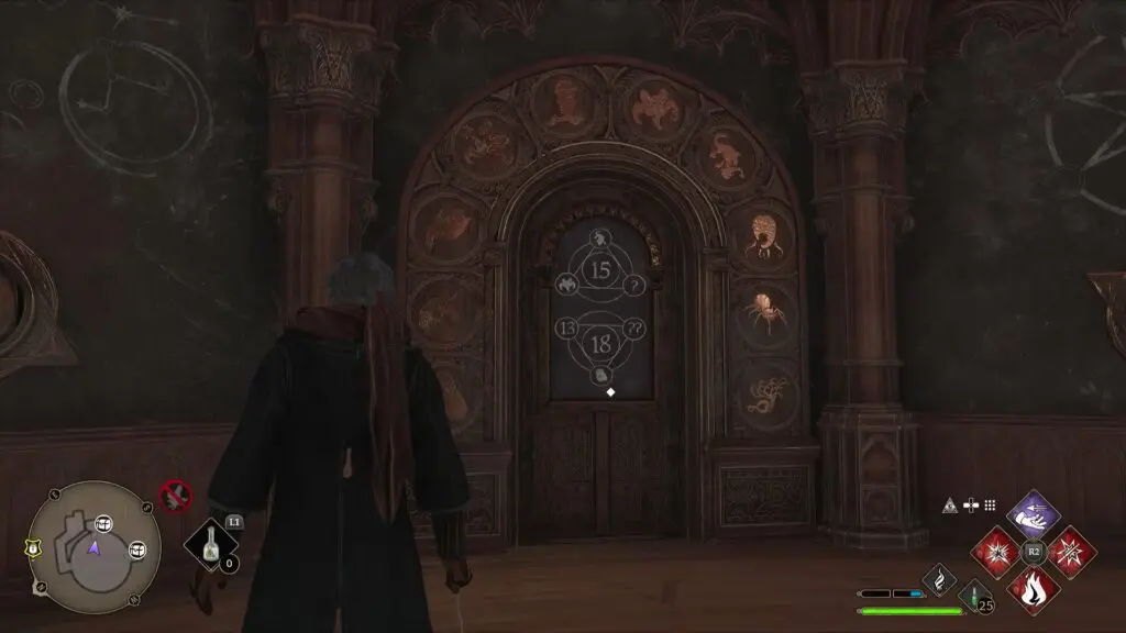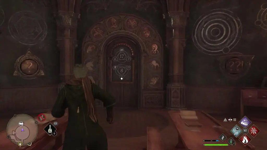Now proceed ahead to reach the Artithmancy Class. There you will find two more puzzle doors as shown in the pictures below. The solution for the 15-18 puzzle door is ?=4 and ??=5. The solution for the 17-8 puzzle door is ?=6 and ??=1. Click here to see how to solve these puzzles. You will find a collection chest behind each door.
