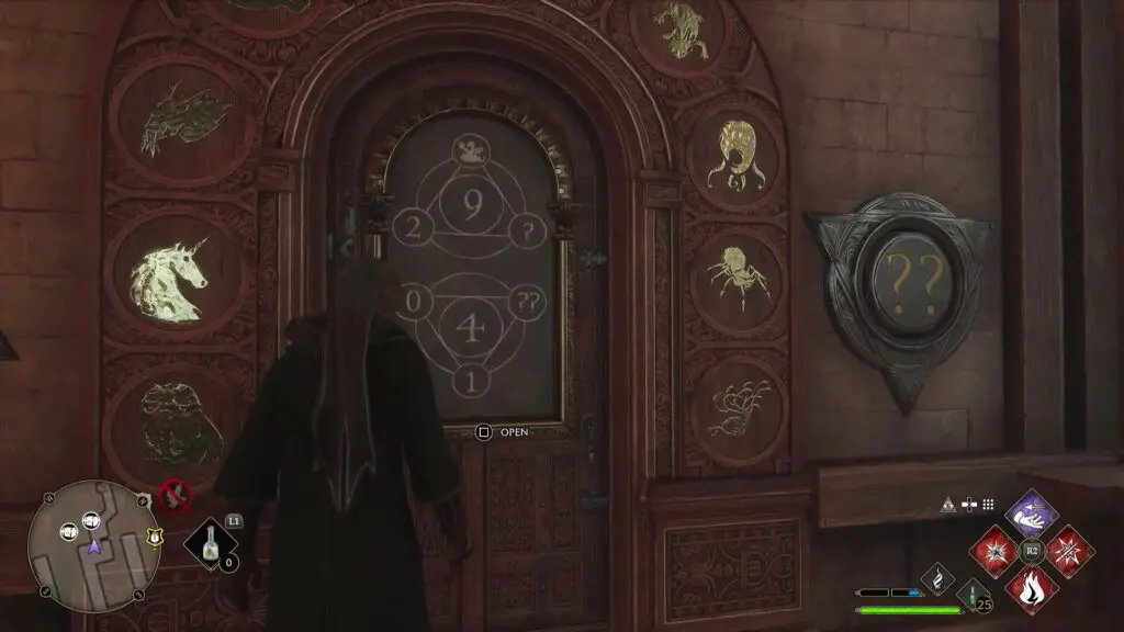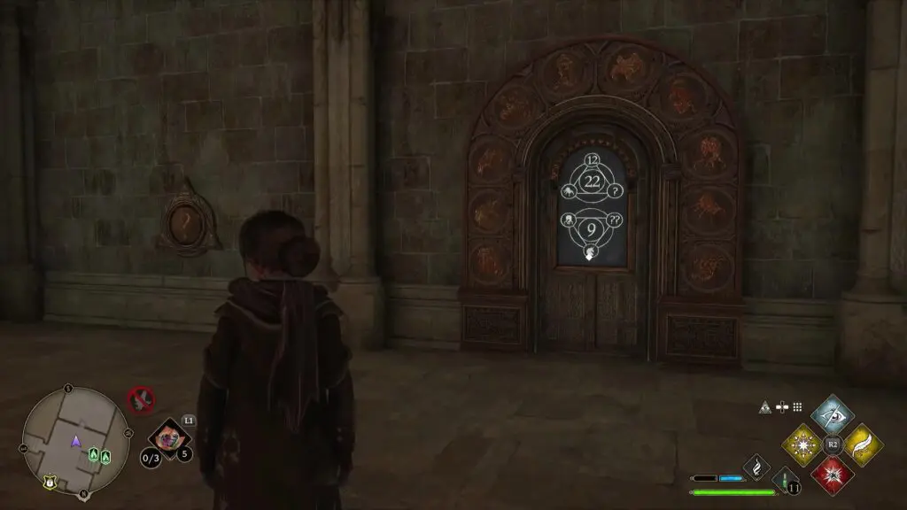 Continue west in the Long Gallery and you will reach a Puzzle Door as shown in the picture below. The solution for this puzzle is ?=2 and ??=1. Click here to see how to solve this puzzle. Go through the door and use Revelio in front of the painting there to get the Field Guide Page.