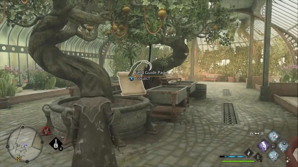 From the Central Hall Floo Flame Location, climb down the stairs then go through the door on the right side to reach the Greenhouses. Now climb down the stairs and go out through the door to find the Field Guide Page as shown in the picture below.